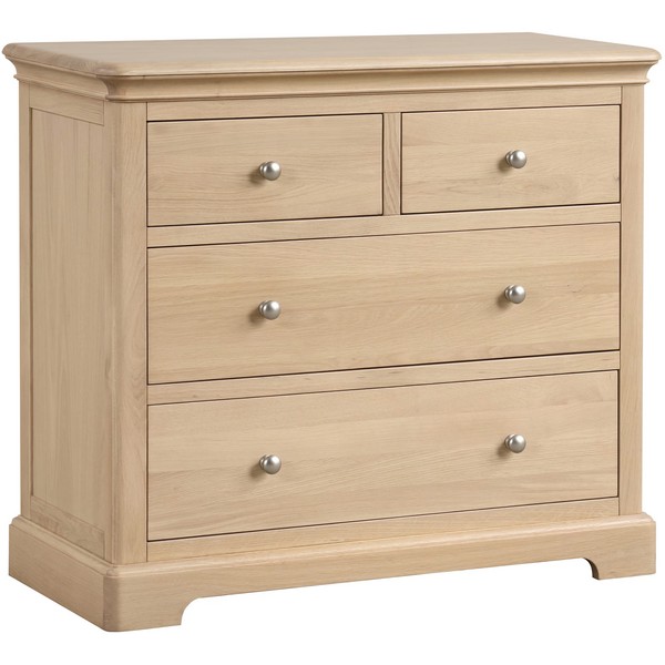 Practical storage options are plentiful with a range of free-standing chests, dressing table and wardrobes to cater for all the storage solutions required. The stylish bed frames feature graceful curved mouldings and solid oak tops to complete the collection. The dressing table need assembly.