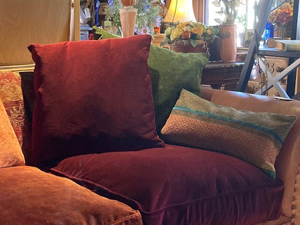 On the left Coco Spice velvet seat cover and matching scatter. On the right Verona Ruby velvet seat cover and matching large scatter. |